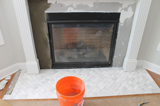I needed to wait 2 weeks until I could seal the fireplace. After taking a trip to the Tile dealer, I learned since my Carrera marble was polished, I didn't need to seal the tile. It took over 2 hours to paint on the grout lines.